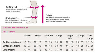 Kantbandet i silikon med en storleksindikator säkerställer att strumporna sitter på plats. Det färgkodade storlekssystemet och indikatorn på kantbandet förenklar valet av rätt storlek och underlättar påtagningen av strumporna. Den markerade hälen bidrar också till att mediven® thrombexin® 18 kan placeras korrekt. Hälområdet är extra känsligt och mediven® thrombexin® 18-strumpans häl är tillverkad av ett fluffigt och mjukt material med hög kapillärkraft. Det gör att fukt kan ledas bort från huden, och därmed minskar risken för maceration. mediven® thrombexin® 18 är förresten utformad för en låromkrets på upp till 100 cm.